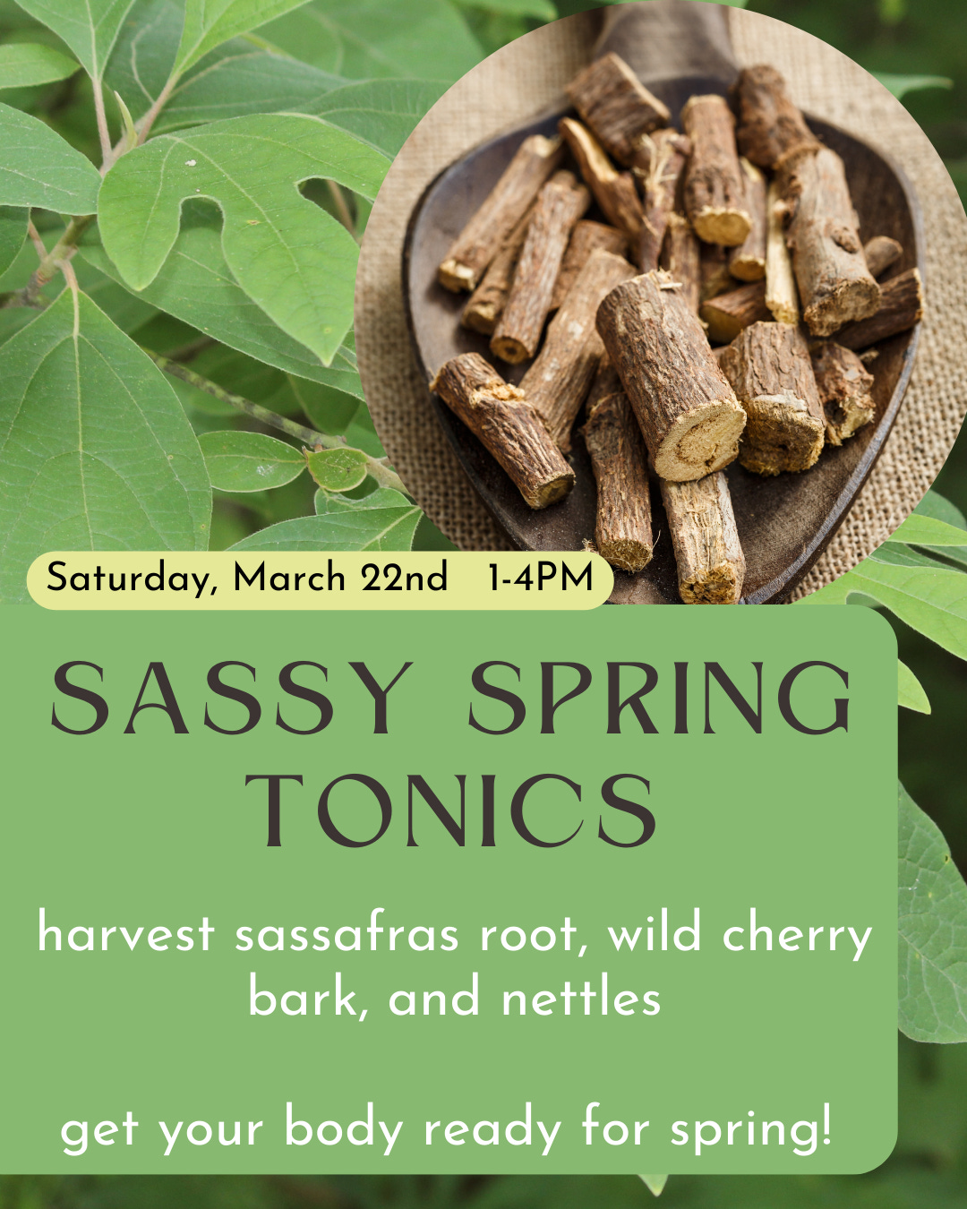 let's get ready for spring! learn how to harvest and use sassafras, wild cherry bark, nettle and other spring plants on March 22 in Berea